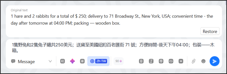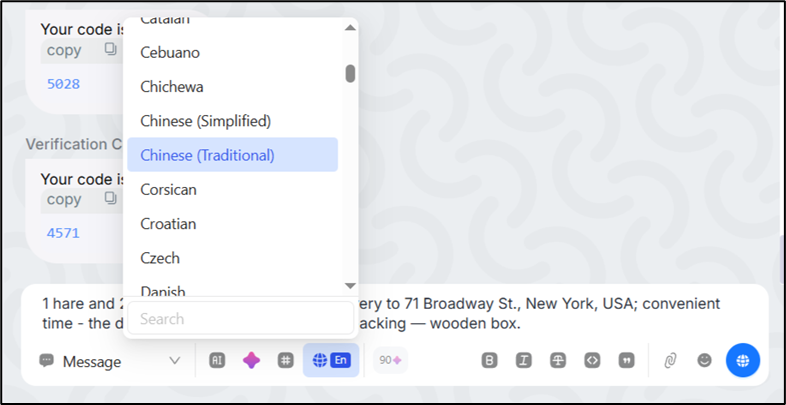 You can get a translation of your message into another language using the assistant. Message translation does not consume the Project's ChatCoins.