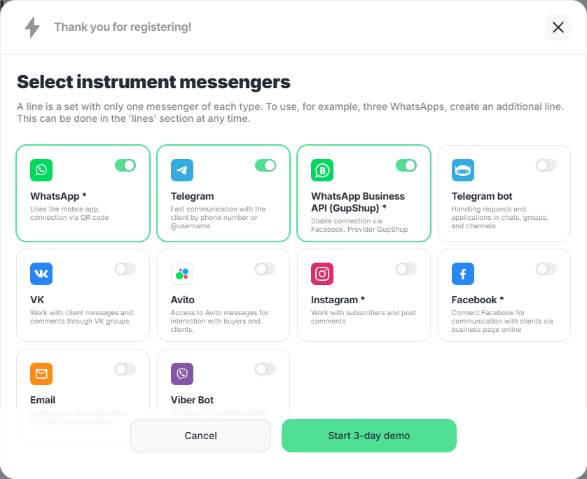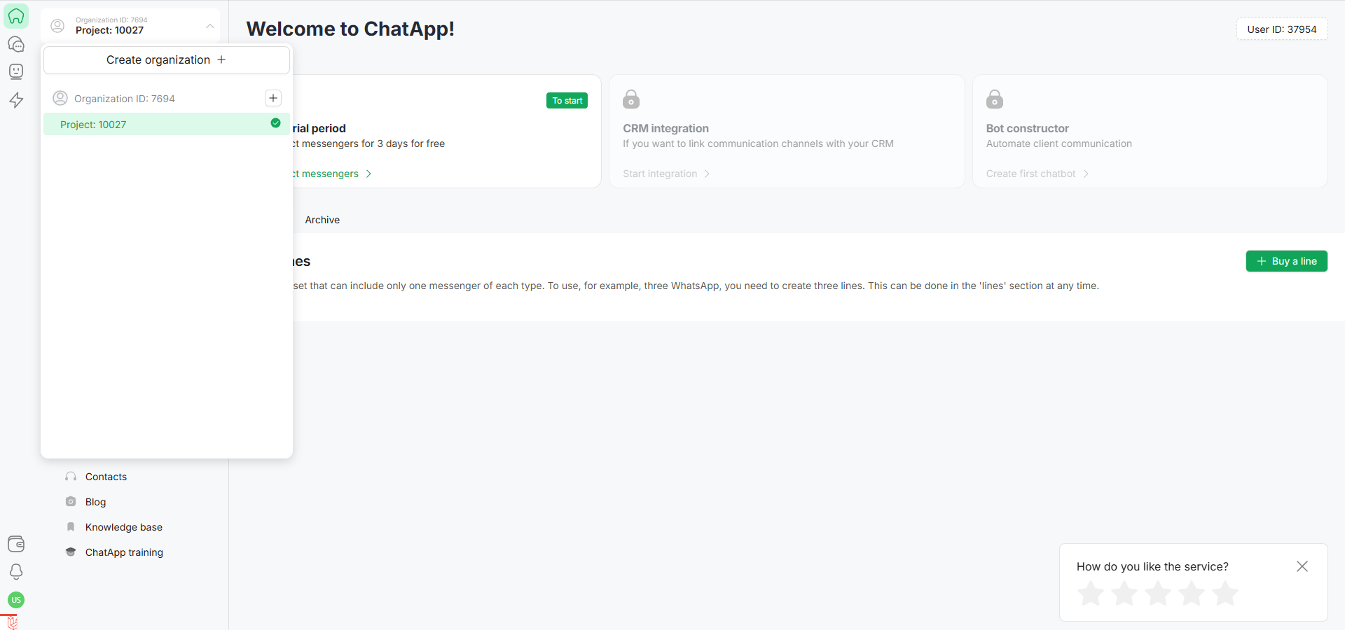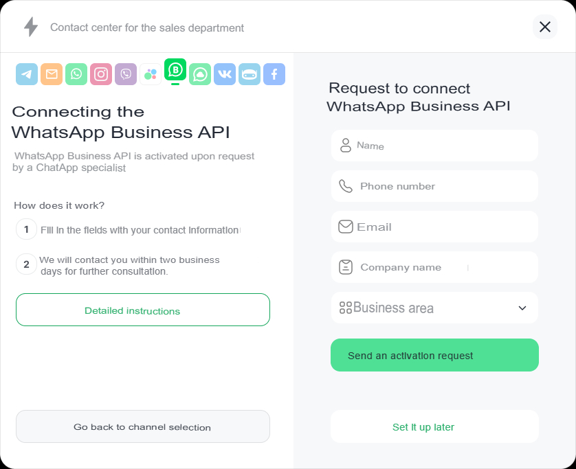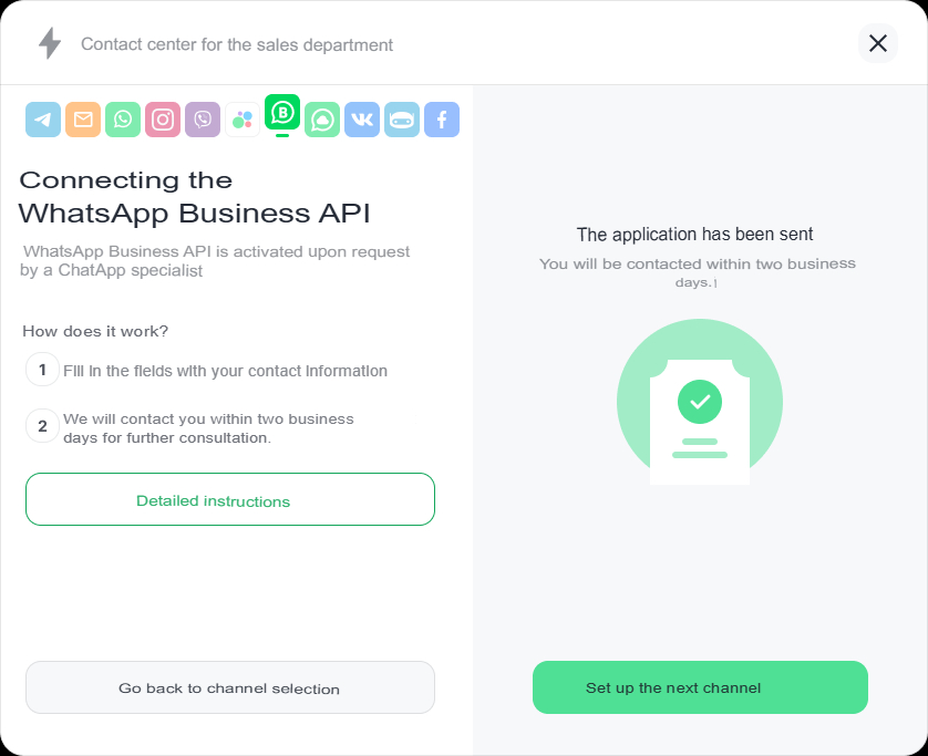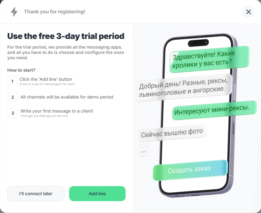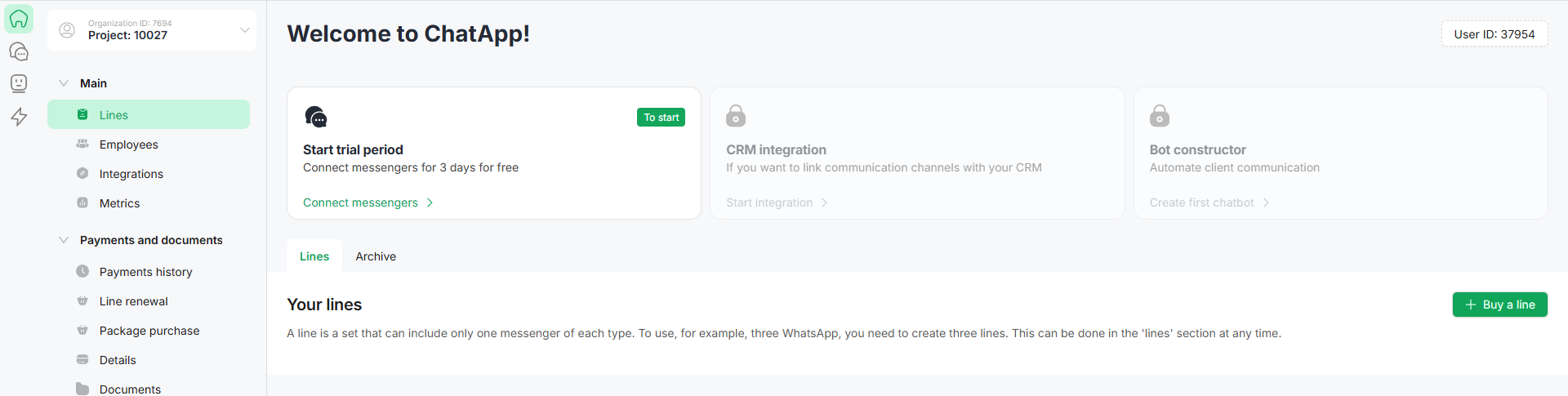 How to set up? 1. Fill in all fields in the connection application form and click the "Submit connection application" button. After submitting your connection request, a manager will contact you for a pre-connection consultation.The process of connecting to the WhatsApp Business API without restrictions takes up to 40 minutes. If your Facebook account has restrictions, it may take up to 48 hours for Facebook to remove the restrictions. 2. Click on the "Configure next channel" button. During the free trial period, you can connect and configure no more than 3 lines. You can purchase a line at any time and get a fully functional version by clicking the "Buy" button on the main page of your Personal Account at the top of the screen or "+ Buy" in the "Lines" section. For instructions, see the article "Purchase of a line". After connecting the channels, the system will prompt you to set up a line by clicking the "Go to Chats" button. For instructions on how to do this, see the article "Setting up the line". You have successfully activated the fully functional version of the software for a limited three-day free trial period and can use the system's features: