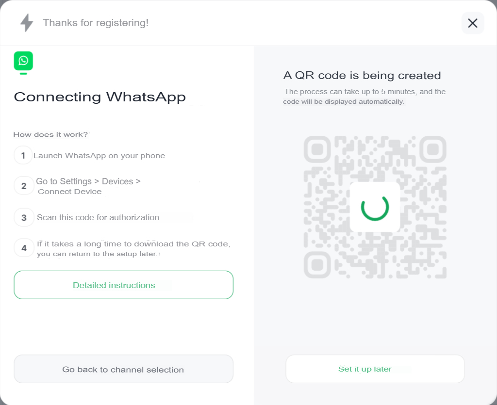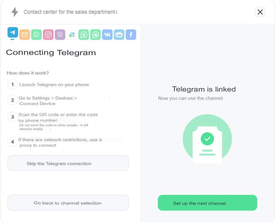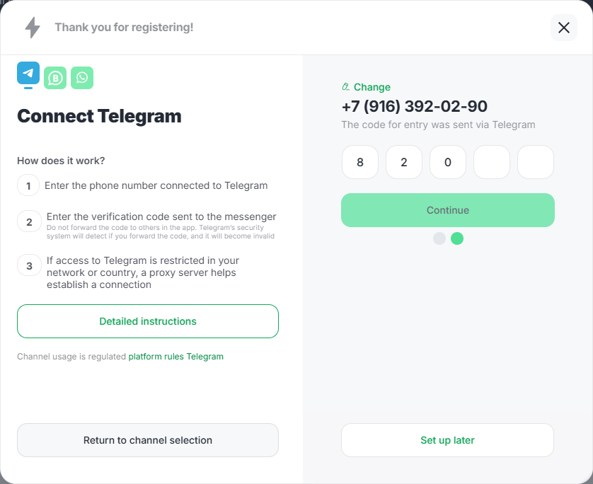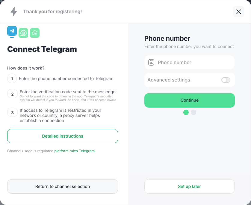 Telegram* Messenger You can set it up using a phone number. 1. Enter your phone number. If you use a proxy, configure it. Click "Continue." 2. Enter the code you received in the messenger message and click the "Continue" button. After checking the code, the system will notify you that the messenger has been linked. WhatsApp Business API The system will offer to configure it with detailed instructions. To connect to WhatsApp Business API you must have: