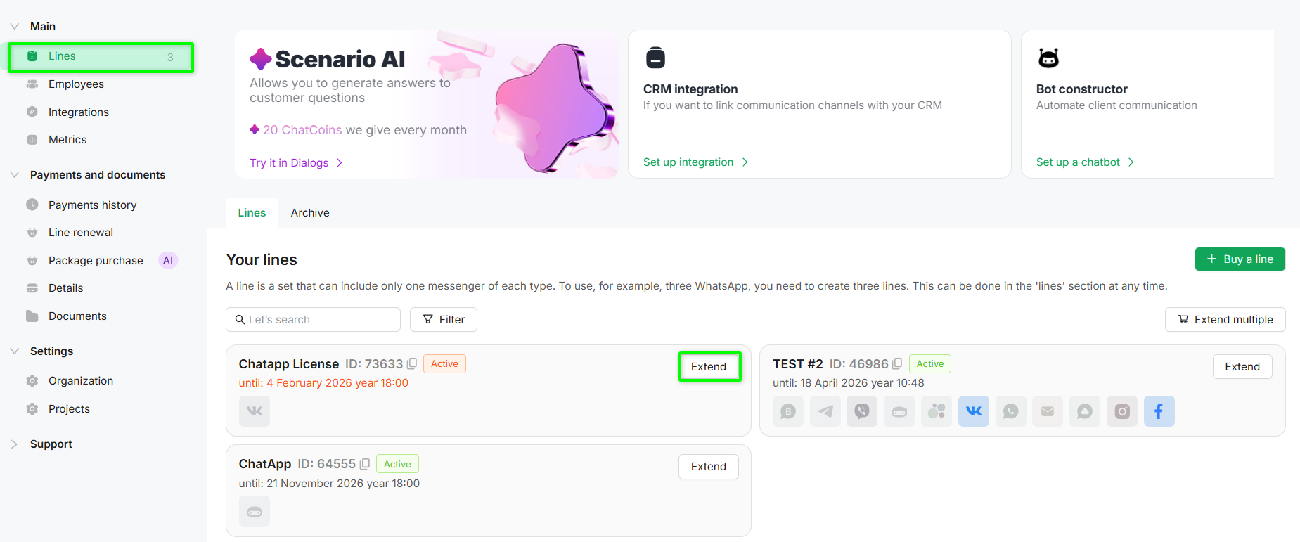 Renewing an existing line allows you to keep the authorization of connected channels without creating a new line.