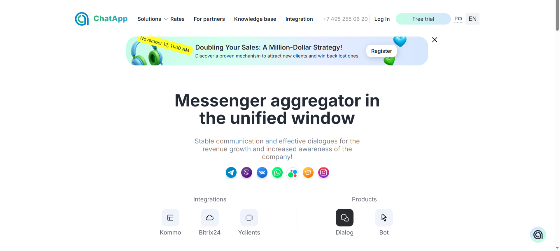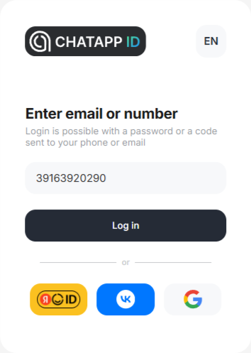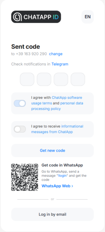 To connect ChatApp: 1.  Go to the website https://chatapp.online. 2.  In the upper right corner of the page, click the "Free trial" button or "Login" if you are already registered. 3.  Enter the User's email address or phone number. Do not enter third-party information, as it will be used to manage access to the Personal Account. We recommend using a corporate email address or phone number. Please enter the phone number in the format +7 (###) ### ## ##. 4. Enter the code you received: