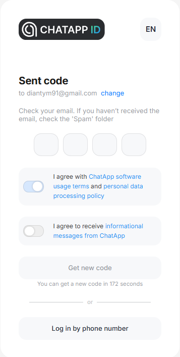 Agree with the terms of use of the software and receiving informational messages from ChatApp. When registering via email, you must link a phone number in the format +7 (###) ### ## ## to your account. A confirmation window will appear when you log in to your personal account.