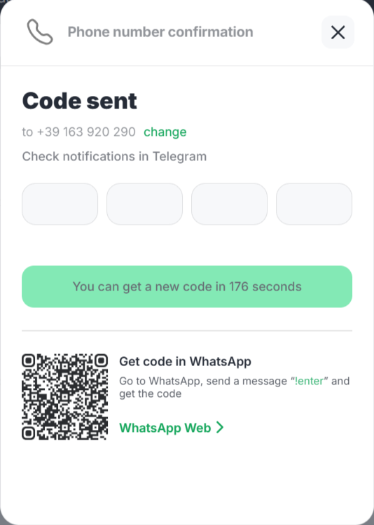 When registering via phone, you can receive the code via WhatsApp: 1. Scan the QR code 2. Follow the generated link, 3. Send a message "Login" 4. Receive the registration code.