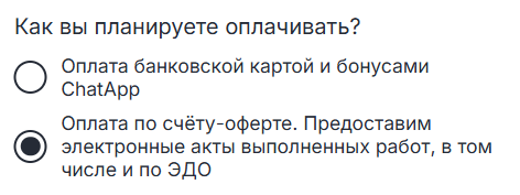 4. Выберите способ оплаты: банковской картой и бонусами ChatApp или по счёту-оферте.