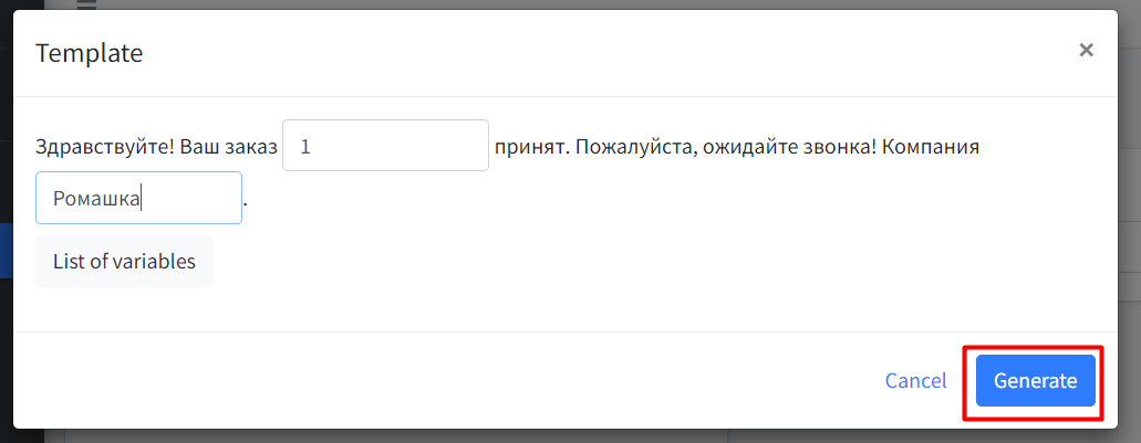 10. Когда все значения будут заполнены, сгенерируйте код шаблона — кнопка «Generate».