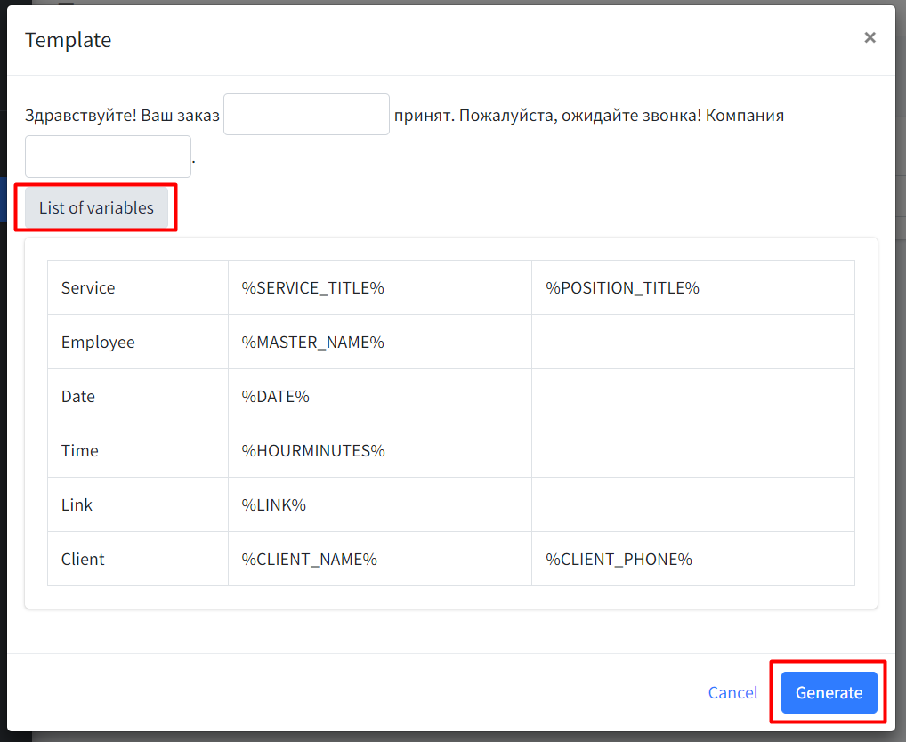 Шаблоны WhatsApp Busines API с переменными можно отправлять клиентам прямо из YCLIENTS. Перед отправкой шаблона проверьте подключение канала WhatsApp Business API и доступные шаблоны с переменными на линии ChatApp.