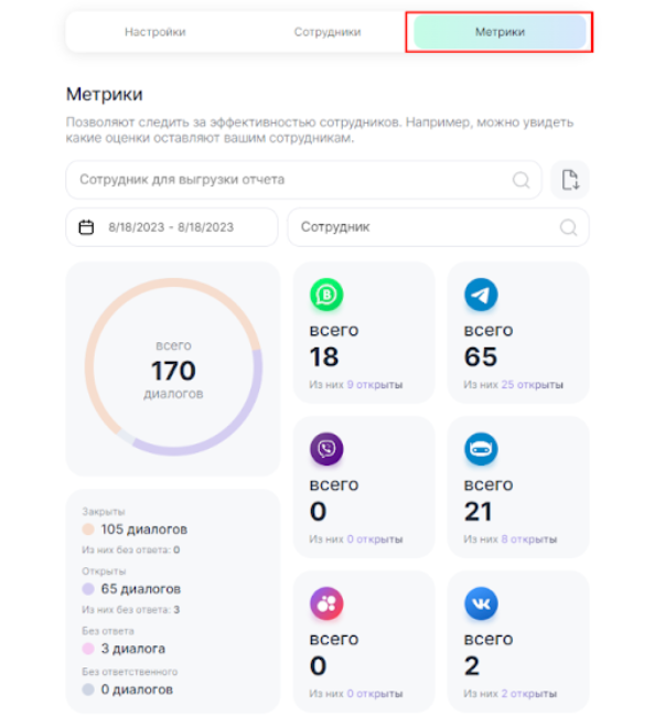 - Выберите «Сотрудник», чтобы посмотреть общую статистику по компании. Из каких мессенджеров клиенты пишут чаще. Внизу указано среднее время ответа, закрытия диалога и оценка.