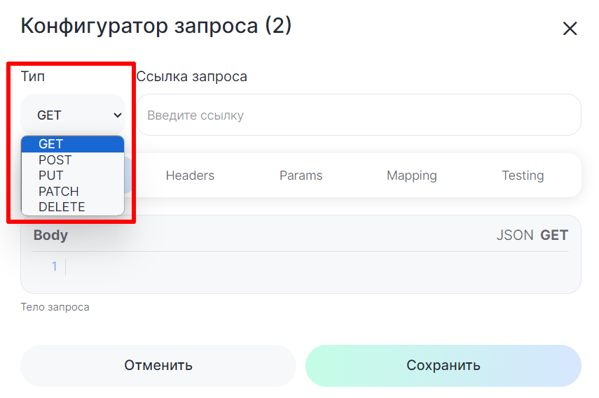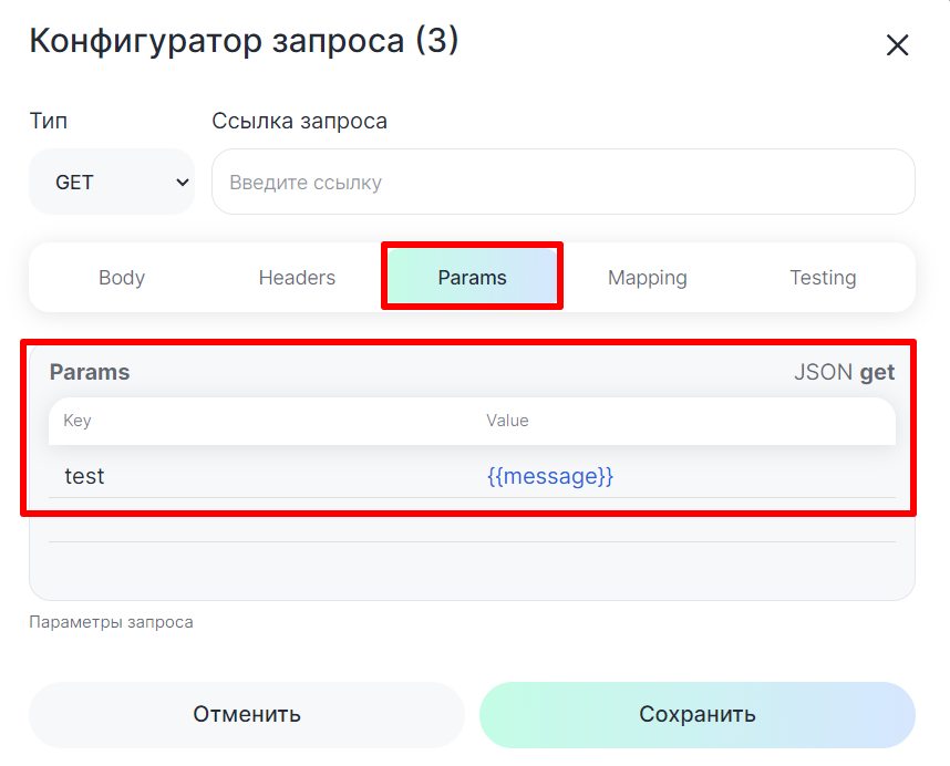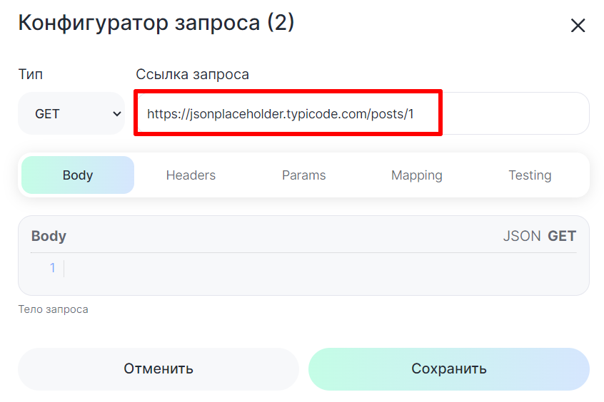 4. Вставьте адрес, на который будет отправлен запрос в поле «Ссылка запроса». Можно использовать переменные.