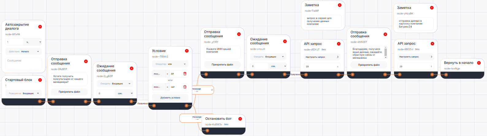 Блок может понадобиться, например, для отдела продаж — бот в диалоге с клиентом запросит ИНН компании, блок «API запрос» отправит результат в сервис автоматической проверки реквизитов компании и внесет данные в карточку компании Битрикс24.