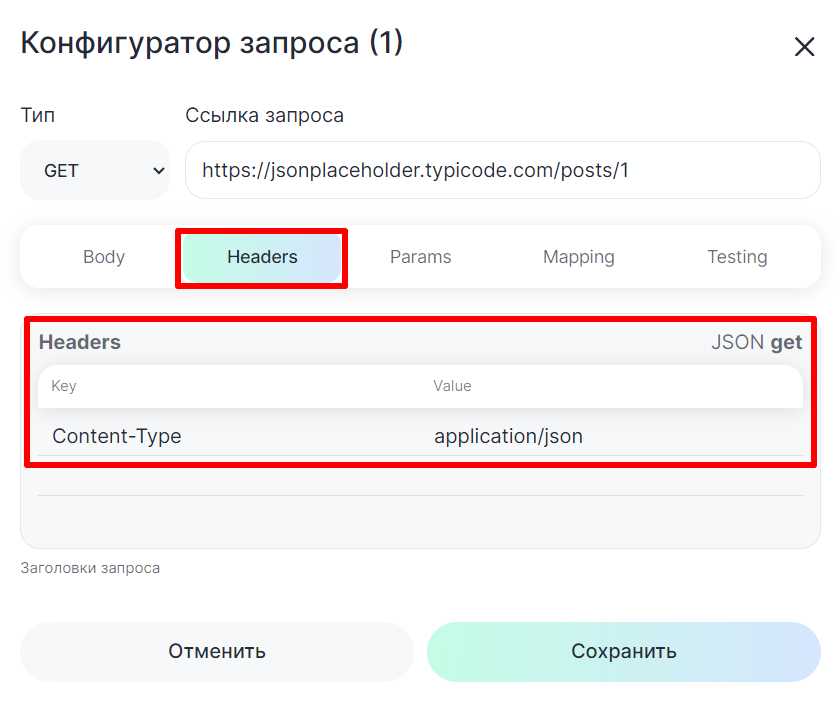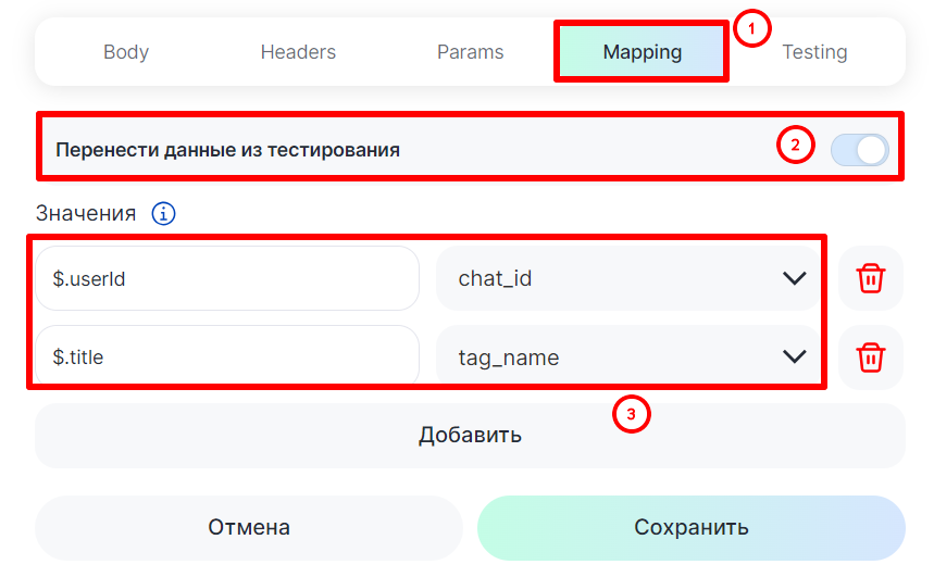 9. Чтобы результат запроса сохранился в переменные, во вкладке «Mapping» нажмите «Передать из тестирования» и выберите нужные переменные для каждого значения. Если значение не нужно сохранять в переменную, то оставьте поле для переменной пустым.