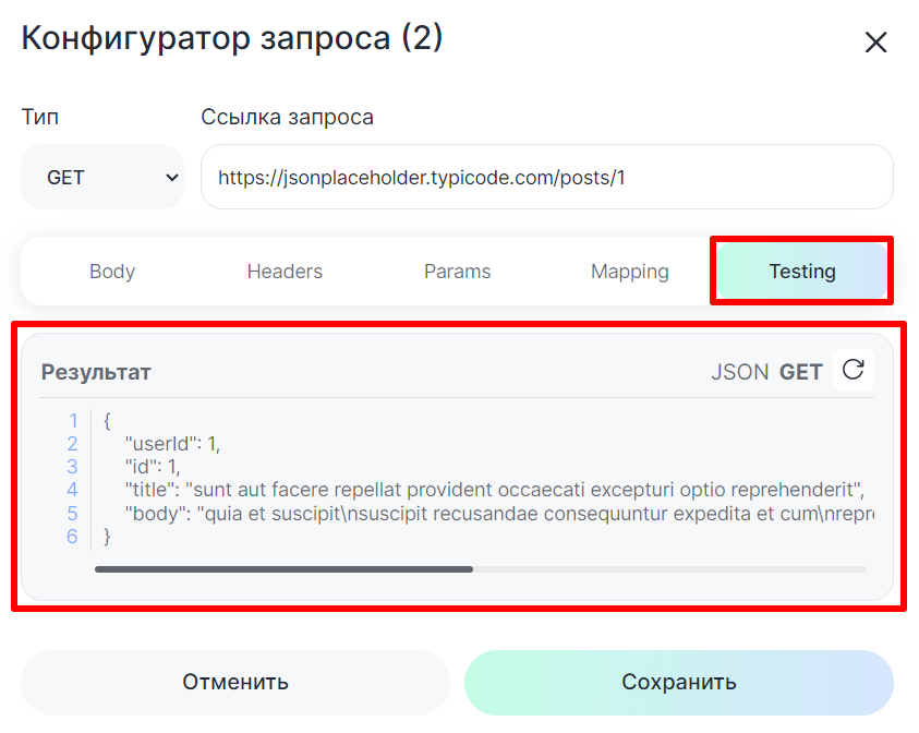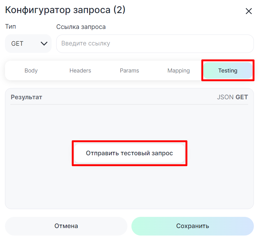 8. Чтобы отправить тестовый запрос и получить результат, нажмите «Отправить тестовый запрос» во вкладке «Testing».