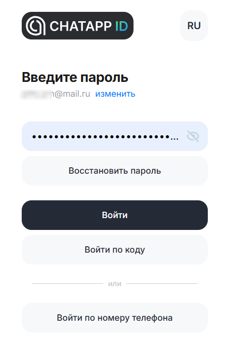 Или нажмите «Войти по коду» и введите код, который придет на почту, ВКонтакте в «Бизнес уведомления» и смс, если вы входите по номеру телефона.