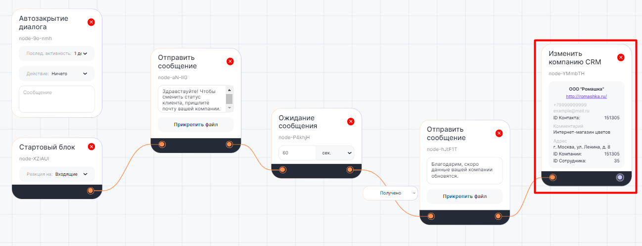 Когда сценарий дойдет до этого блока, в CRM-системе будут автоматически изменены данные компании.