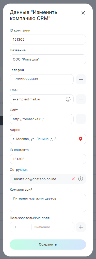 - Блок "Изменить компанию CRM" обновляет данные компании.