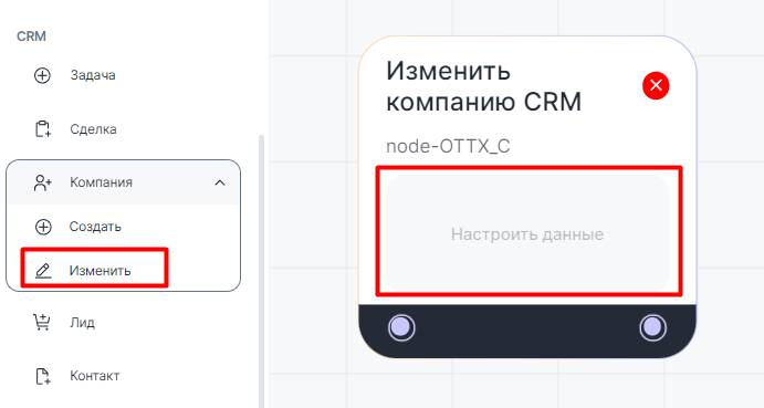 2. В меню CRM выберите вкладку «Компания» и действие «Изменить». Добавьте блок «Изменить компанию CRM» на рабочую область:
