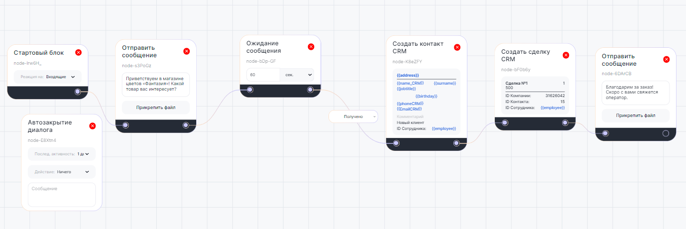Например, клиент хочет заказать букет в интернет-магазине цветов. В приведенном примере сценария бот:
