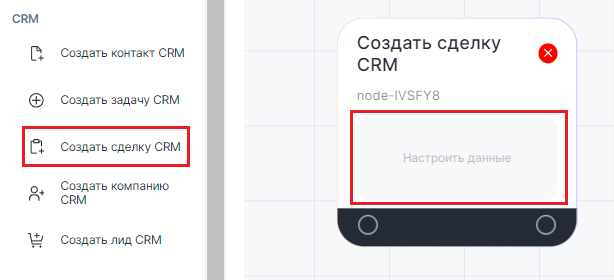 1. В Конструкторе ботов выберите блок «Создать сделку в CRM» и добавьте в рабочую область.