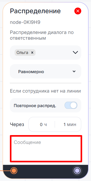 Блок «Распределение» назначает сотрудника, ответственного за диалог. Это пригодится, когда бот собрал нужную информацию и пора подключить в диалог оператора.