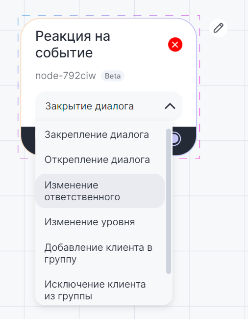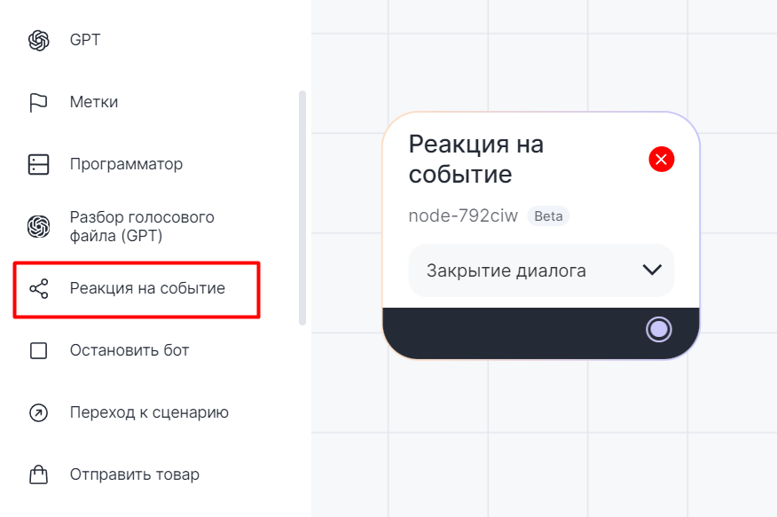 Блок «Реакция на событие» позволяет запускать сценарии или части сценария в ответ на события в системе ChatApp. Например, закрытие чата в ChatApp Диалог.