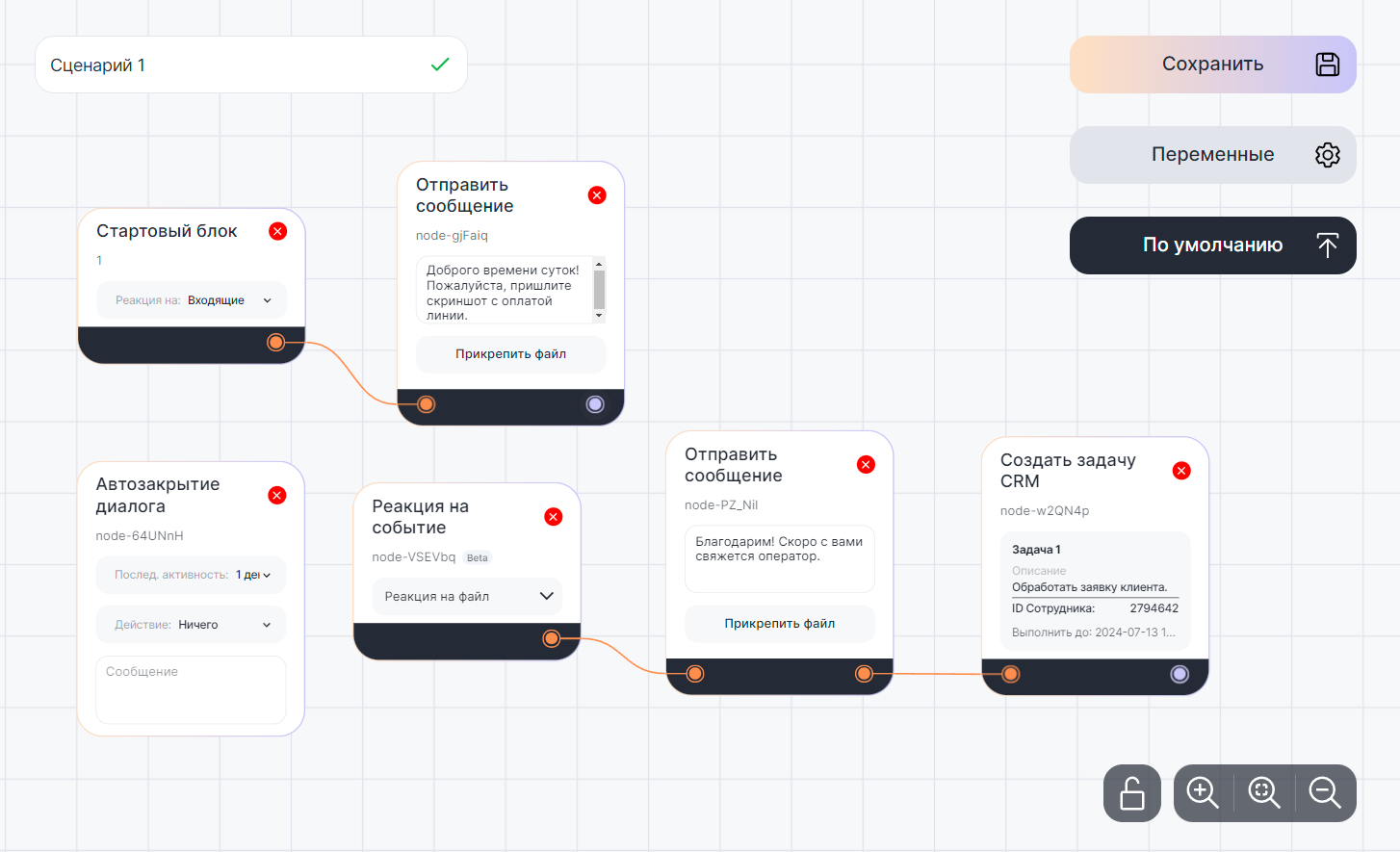 Например, если клиент пришлет файл — сработает блок «Реакция на событие» и бот запустит следующий блок «Отправить сообщение».