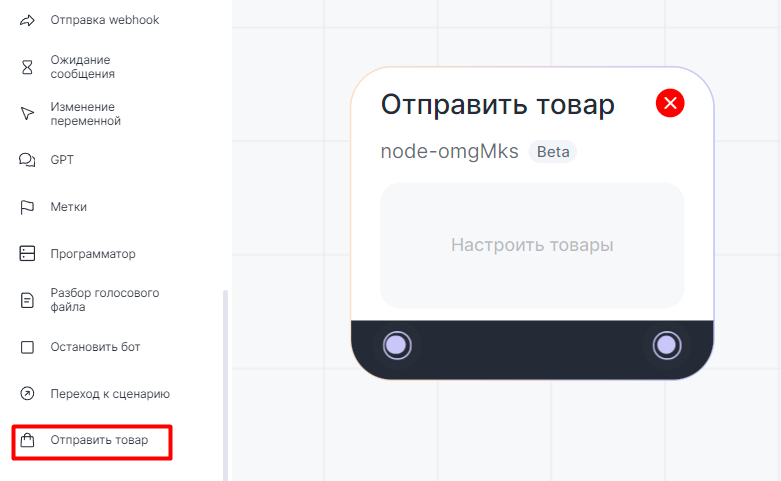 1. Перейдите в Редактор сценариев и добавьте блок «Отправить товар» в рабочую область.