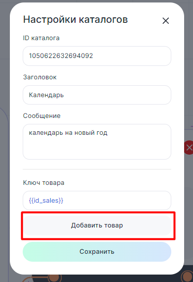 - Ключ товара — ID товара, который будет отображен (обязательное поле, можно добавить переменную).