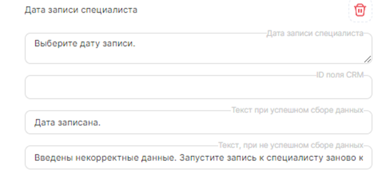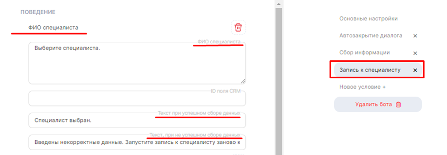 - В окнах «Текст, при не успешном сборе данных» напишите, что данные введены неправильно, и подскажите клиенту как запустить запись по новой. Например: «Введены некорректные данные. Запустите запись к специалисту заново написав Старт.»