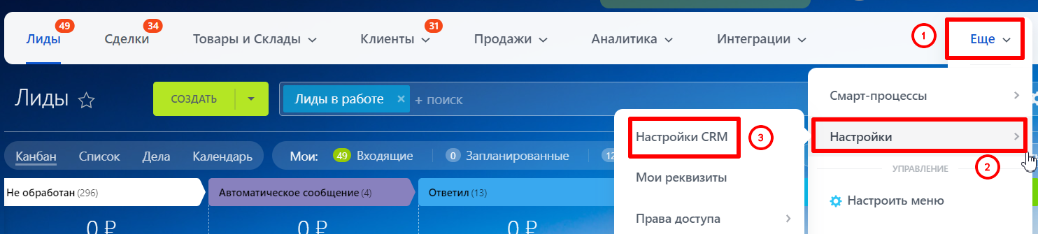 На главной странице нажмите «Еще» — «Настройки» — «Настройки CRM».
