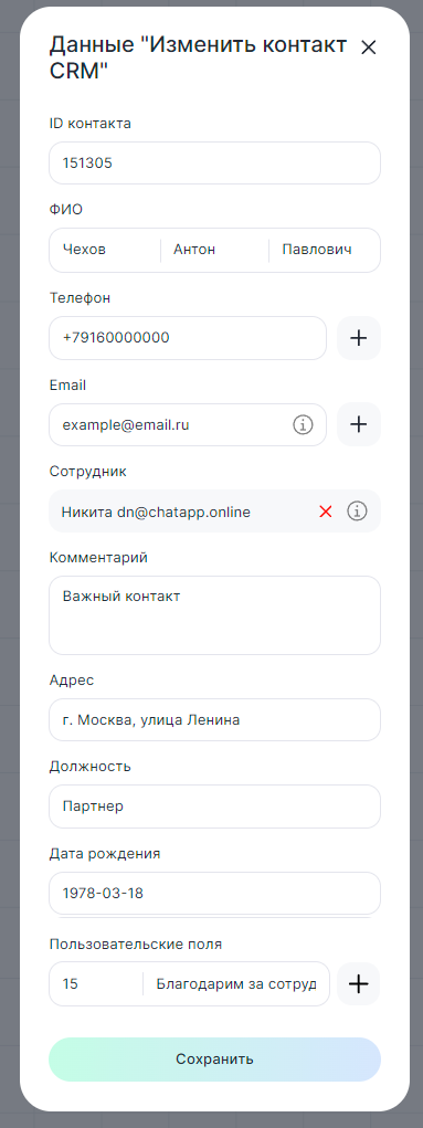 Когда сценарий дойдет до этого блока, в CRM-системе будут автоматически изменены данные контакта.