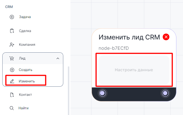 Важно: блок «Изменить лид CRM» только изменяет элемент, он не сможет проверить наличие лида в CRM-системе.