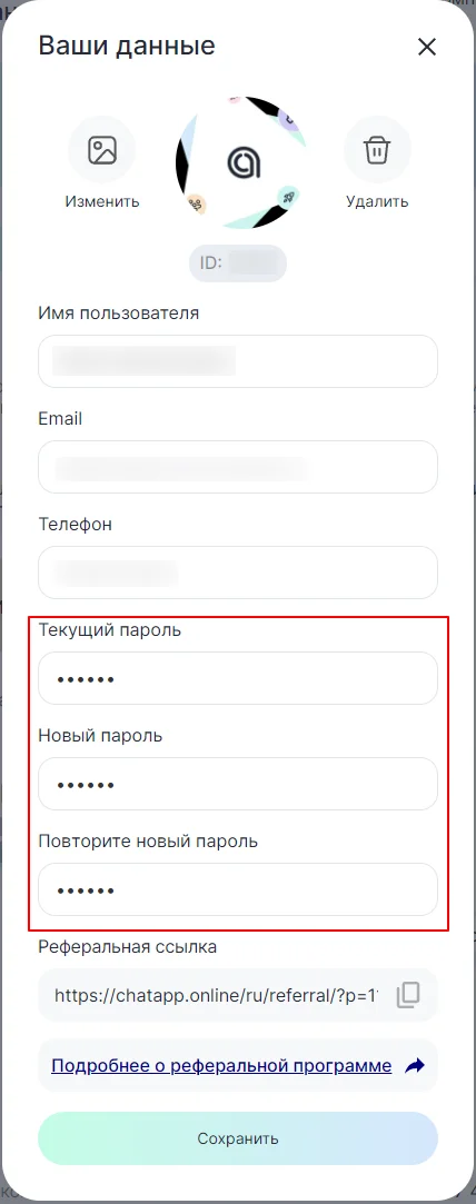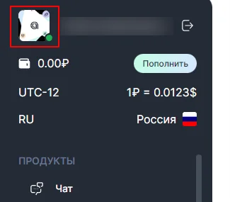 - Войдите в Личный кабинет ChatApp и нажмите на аватар пользователя в боковом меню (в левом верхнем углу экрана)