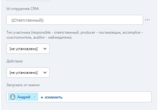 - ID сотрудника CRM - подставить id сотрудника из сделки или лида, которого следует прикрепить или открепить в участников чата.