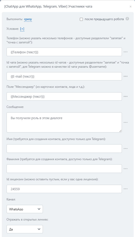 - ID чата - укажите id чата из ChatApp Dialog или @username пользователя Telegram, если недоступен номер телефона.