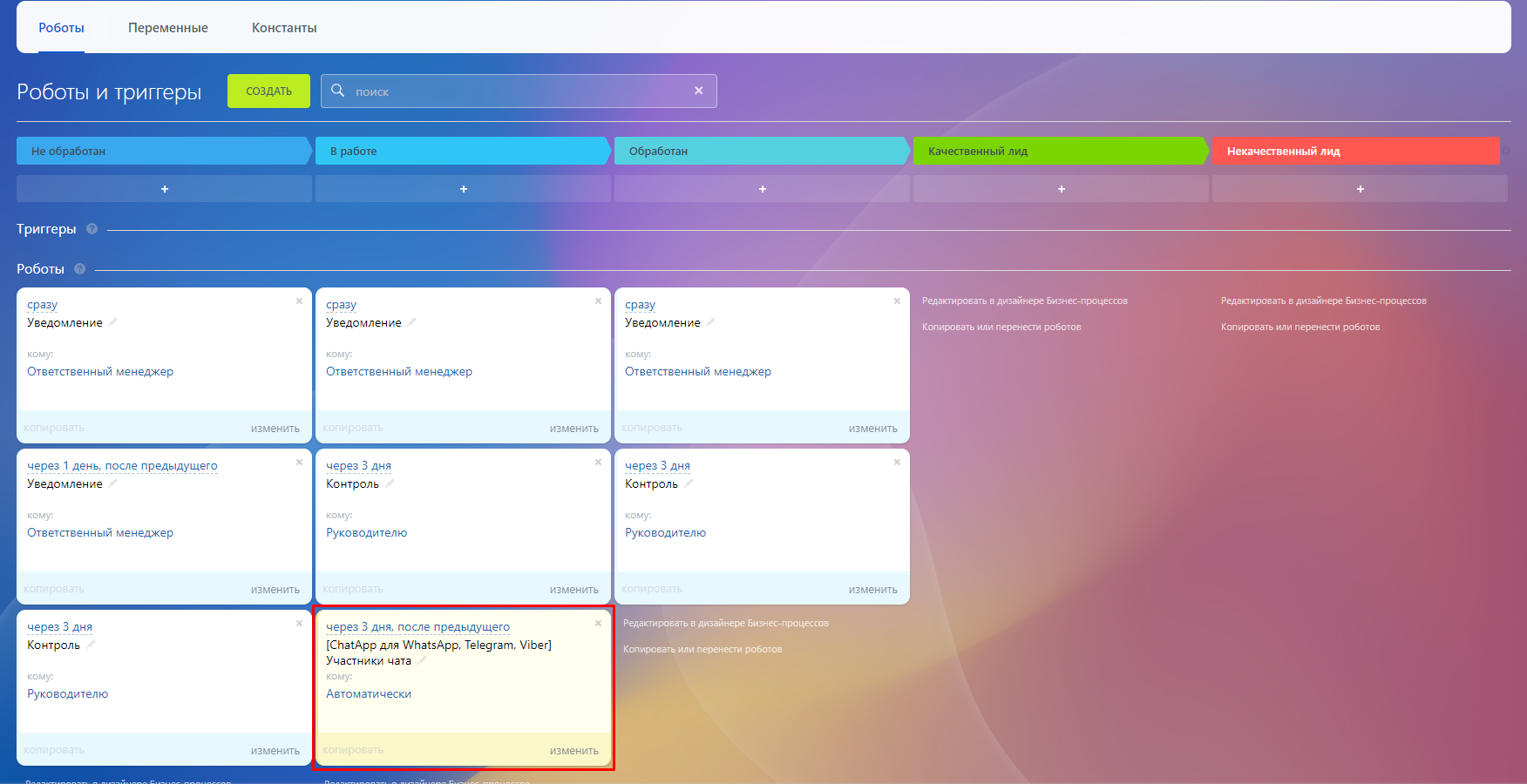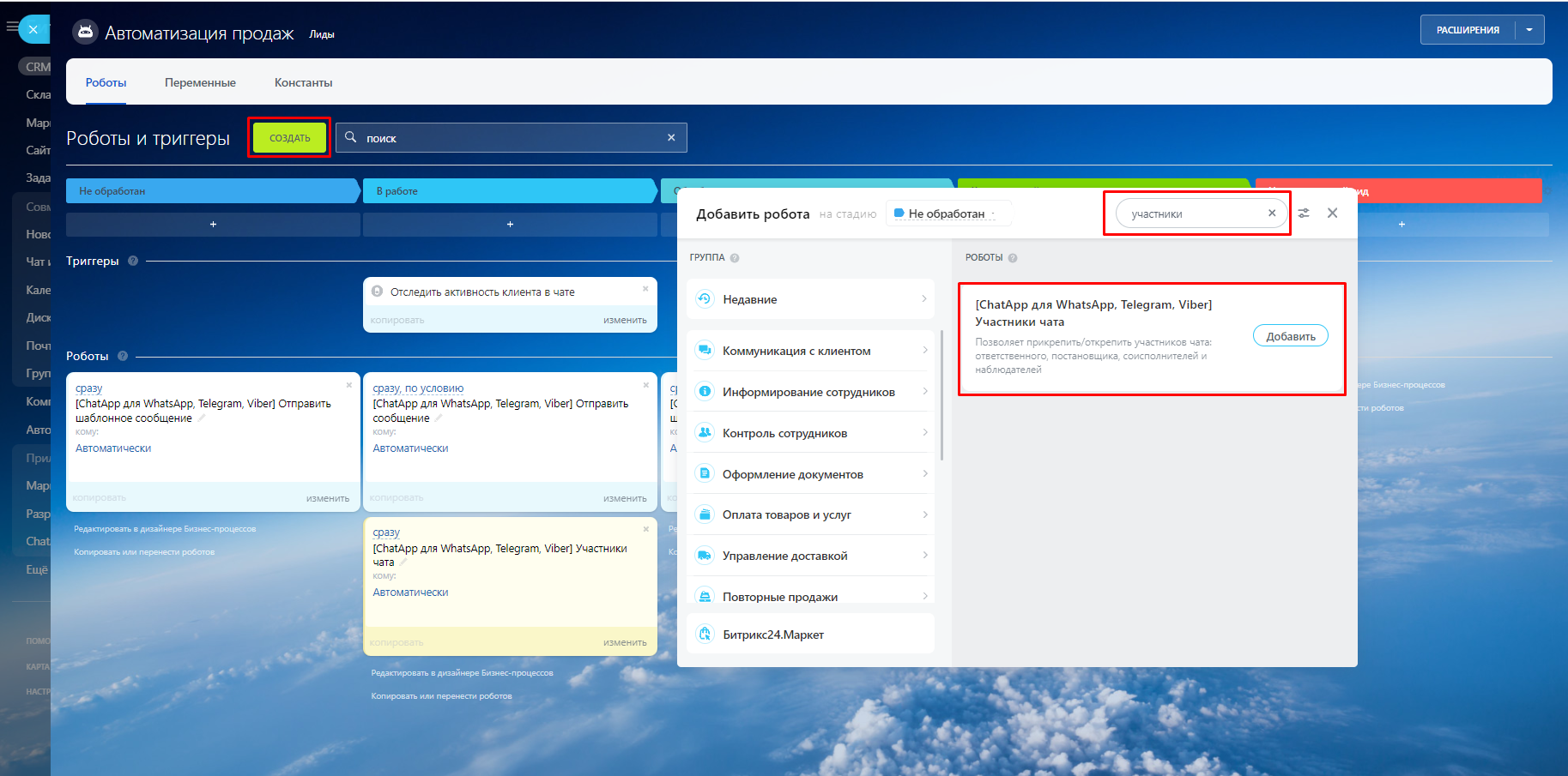 - Перейдите на платформу Битрикс24 и добавьте нового робота на выбранную стадию сделки.