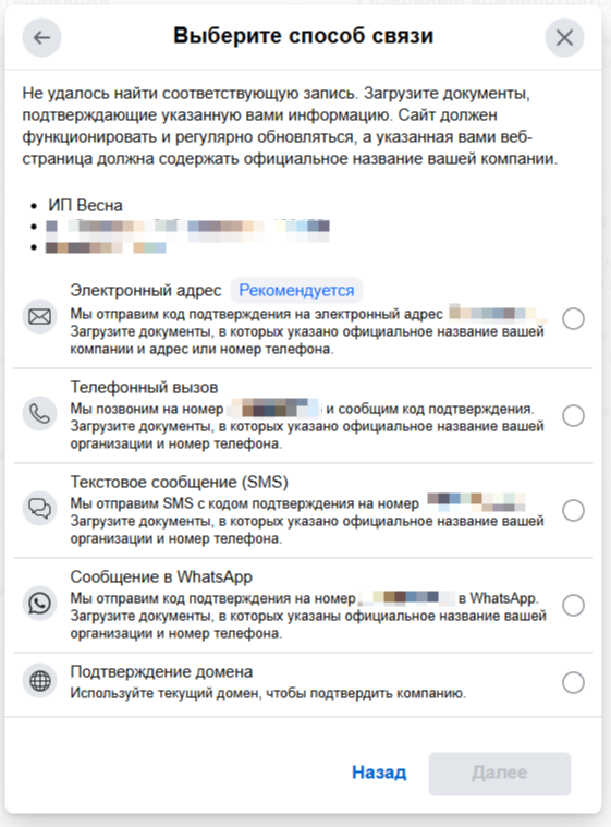 Если кнопка «Подтверждение компании» в Facebook Business Manager* неактивна