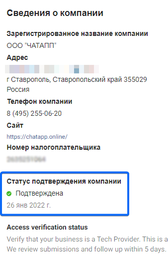 Если кнопка подтверждения компании неактивна, необходимо сначала подключить в компании WhatsApp Business API. Это повысит уровень доверия к компании у Facebook*.