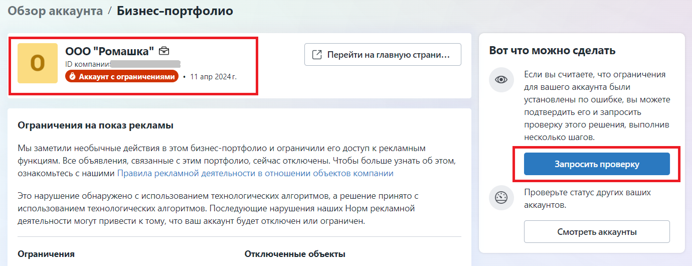 4. Перед подачей заявки на подтверждение также важно проверить, нет ли ограничений у личной страницы и компании. При наличии ограничений можно запросить проверку.