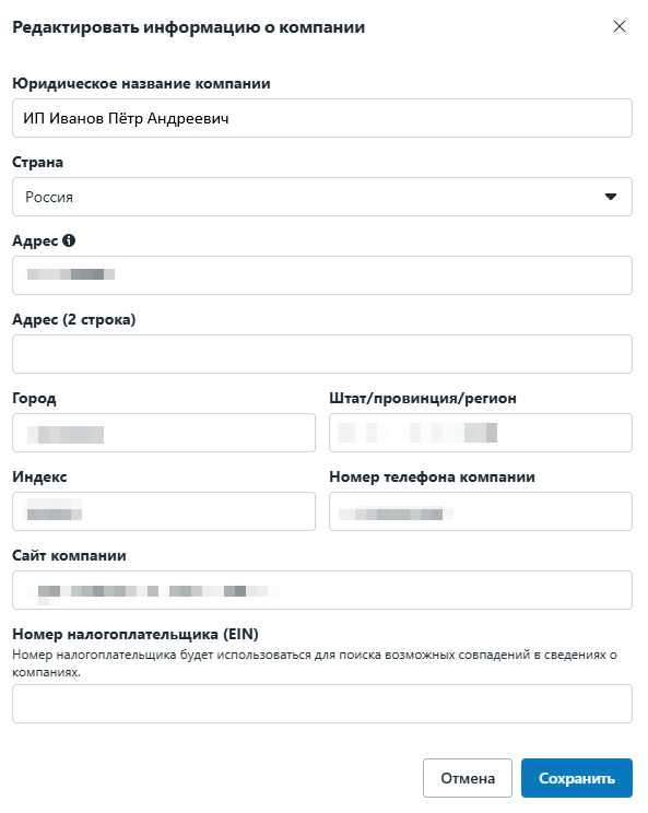 «Адрес, строка 1», «Город», «Штат/провинция/регион», «Индекс» — в полном соответствии с юридическим адресом компании, указанным в документах о регистрации.