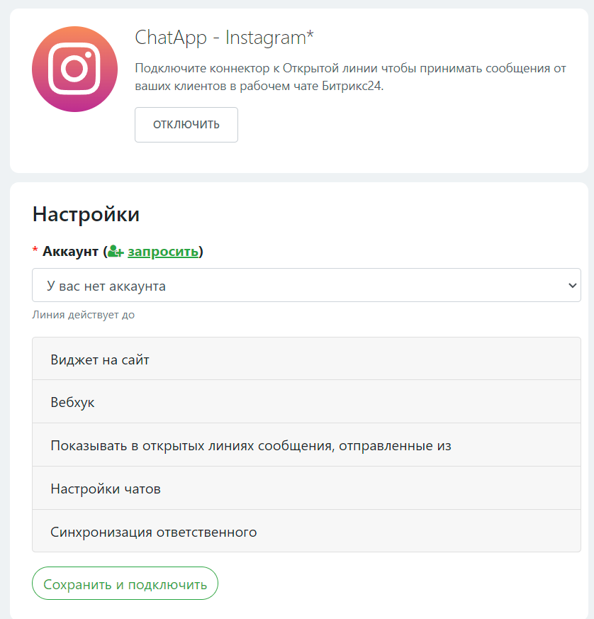 - Если аккаунт Instagram* не подключен, нажмите «запросить» и установите подключение в Личном кабинете ChatApp.