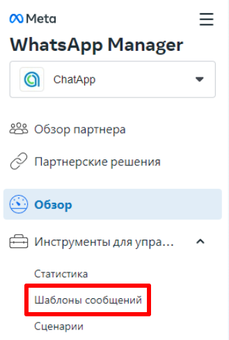 4. В WhatsApp Manager откройте вкладку «Инструменты для управления» и выберите «Шаблоны сообщений».