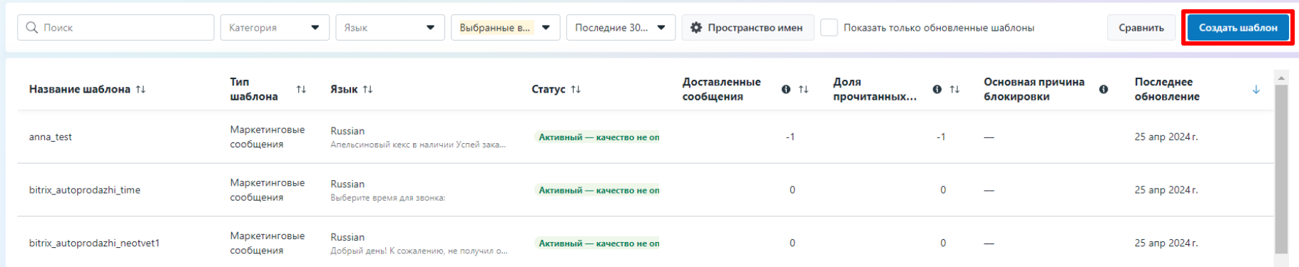 Шаблон будет отправлен на проверку. Статус можно посмотреть в разделе «Шаблоны сообщений». После одобрения шаблона его можно использовать для отправки сообщений.