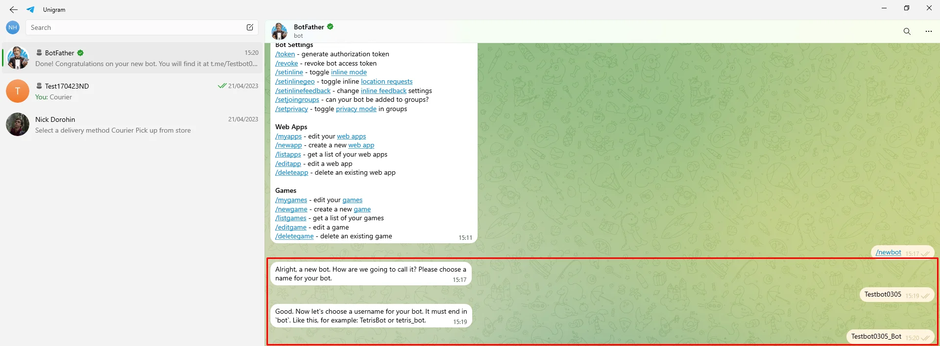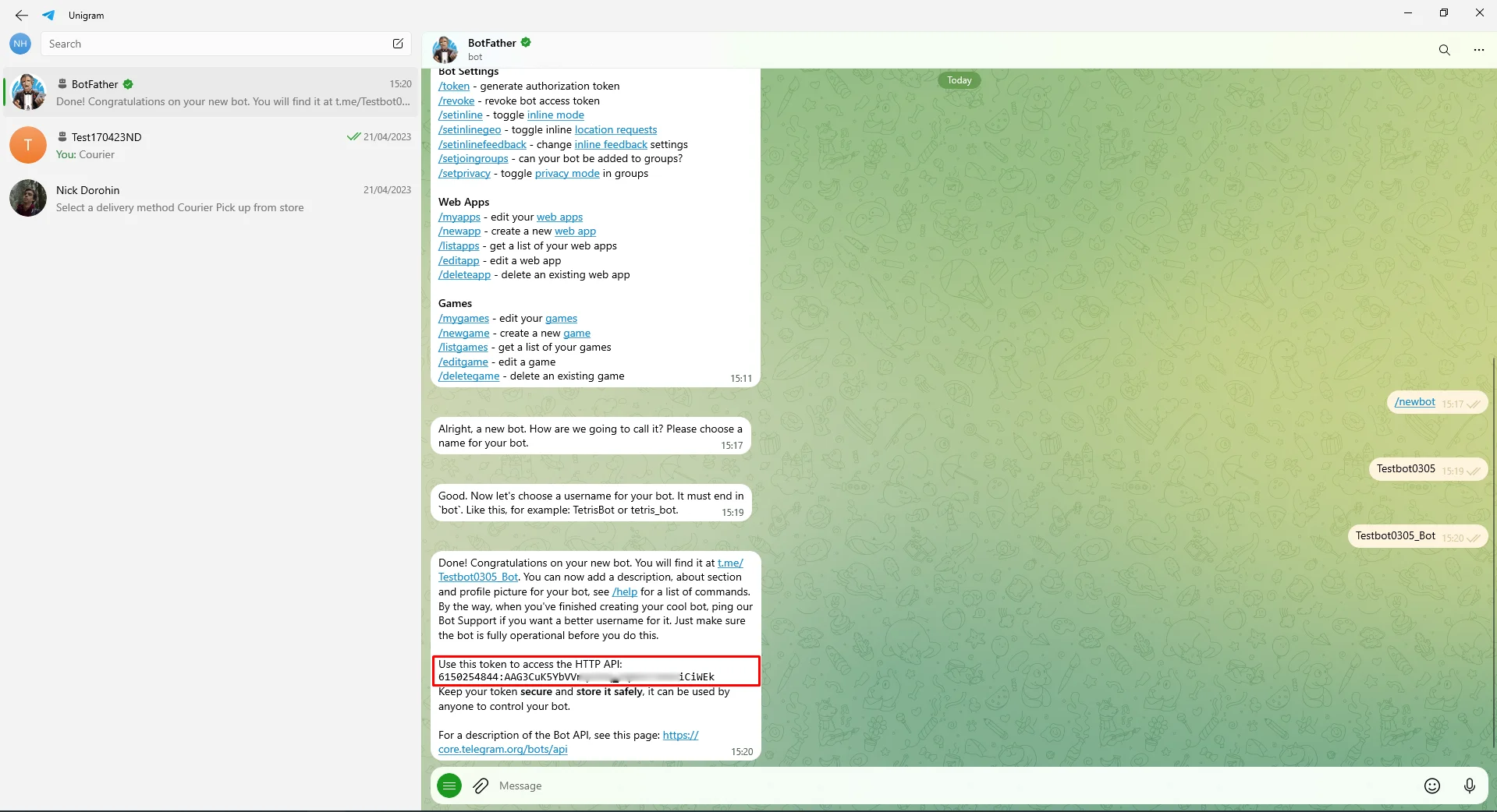 Итак, персональный Telegram bot создан, осталось лишь подключить его к сервису ChatApp.