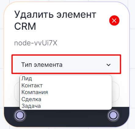 1. В Конструкторе ботов в разделе CRM выберите «Удалить» и добавьте блок в рабочую область.