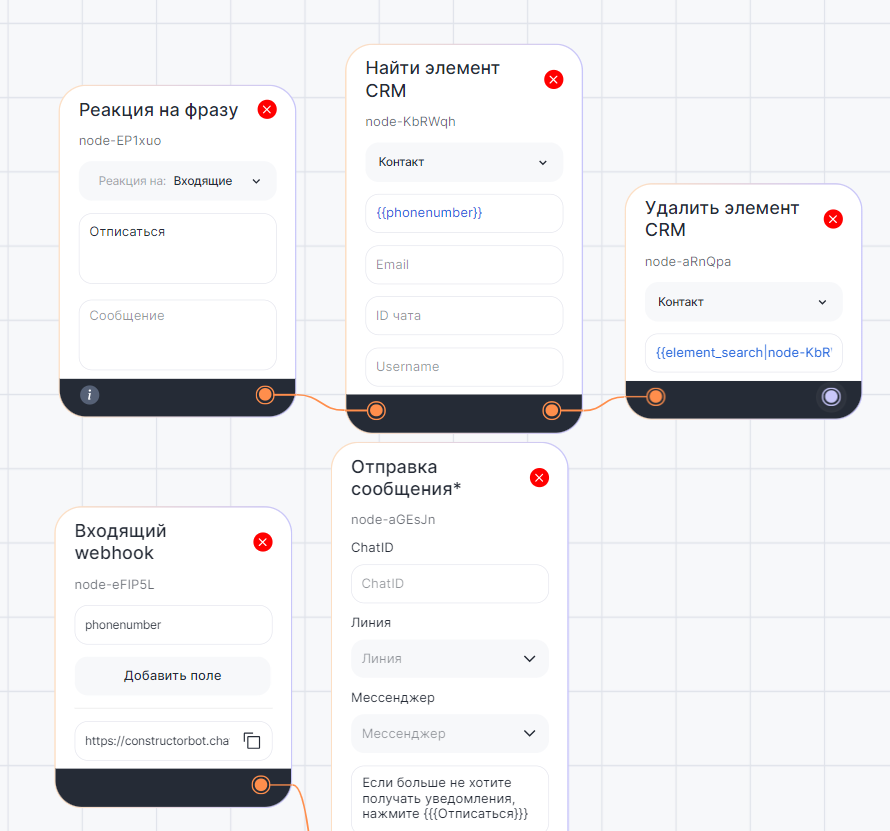 - Если клиент выбрал «Отписаться», блок «Найти элемент CRM» находит контакт по номеру телефона;
