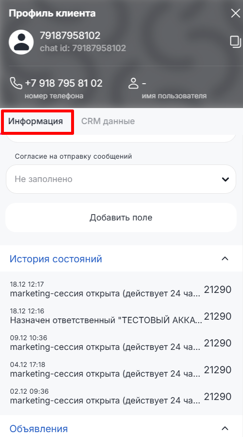 • История состояний — отображает историю состояний диалога. Назначение, изменение и удаление ответственного, наблюдателя и соисполнителя. Назначение и изменение уровня. Открытие и закрытие диалога. Для канала WABA — открытие и закрытие 24-х часового окна. Каждое изменение отображается с датой и временем;