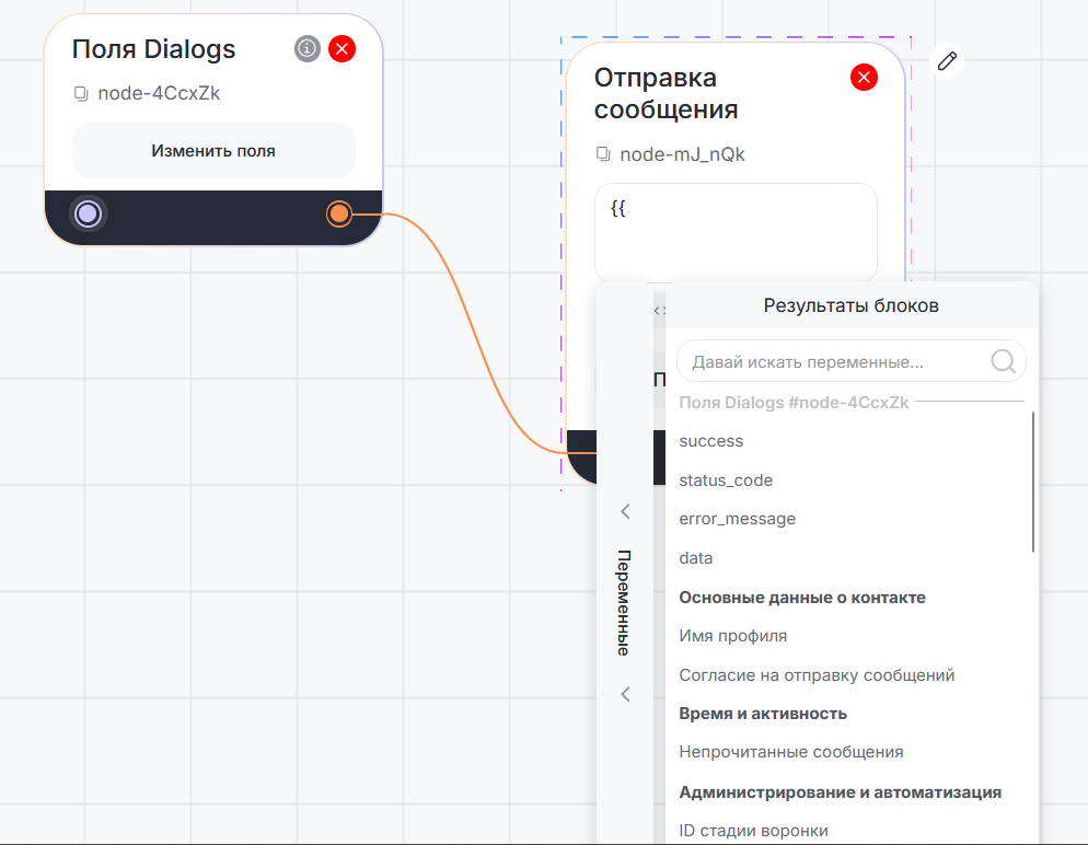 При получении полей их значения становятся доступны для последующего использования в сценариях. Также с помощью блока можно обновлять параметры профиля клиента — менять стадию воронки, назначать ответственных и уровень, заполнять согласие на отправку маркетинговых сообщений и другие данные.
