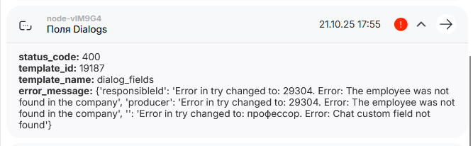 В случае ошибки записи одного или нескольких полей в журнал записывается лог с результатом false и текстом ошибки: