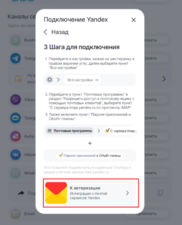 2. Нажмите на Яндекс и «К авторизации»;