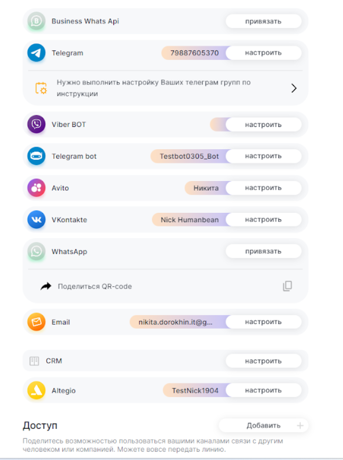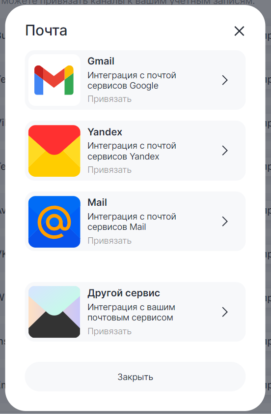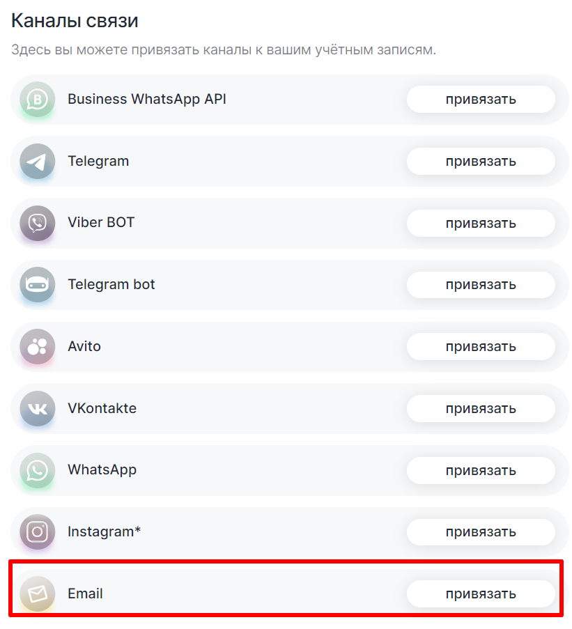 2. Найдите Email в каналах связи и нажмите «Привязать».