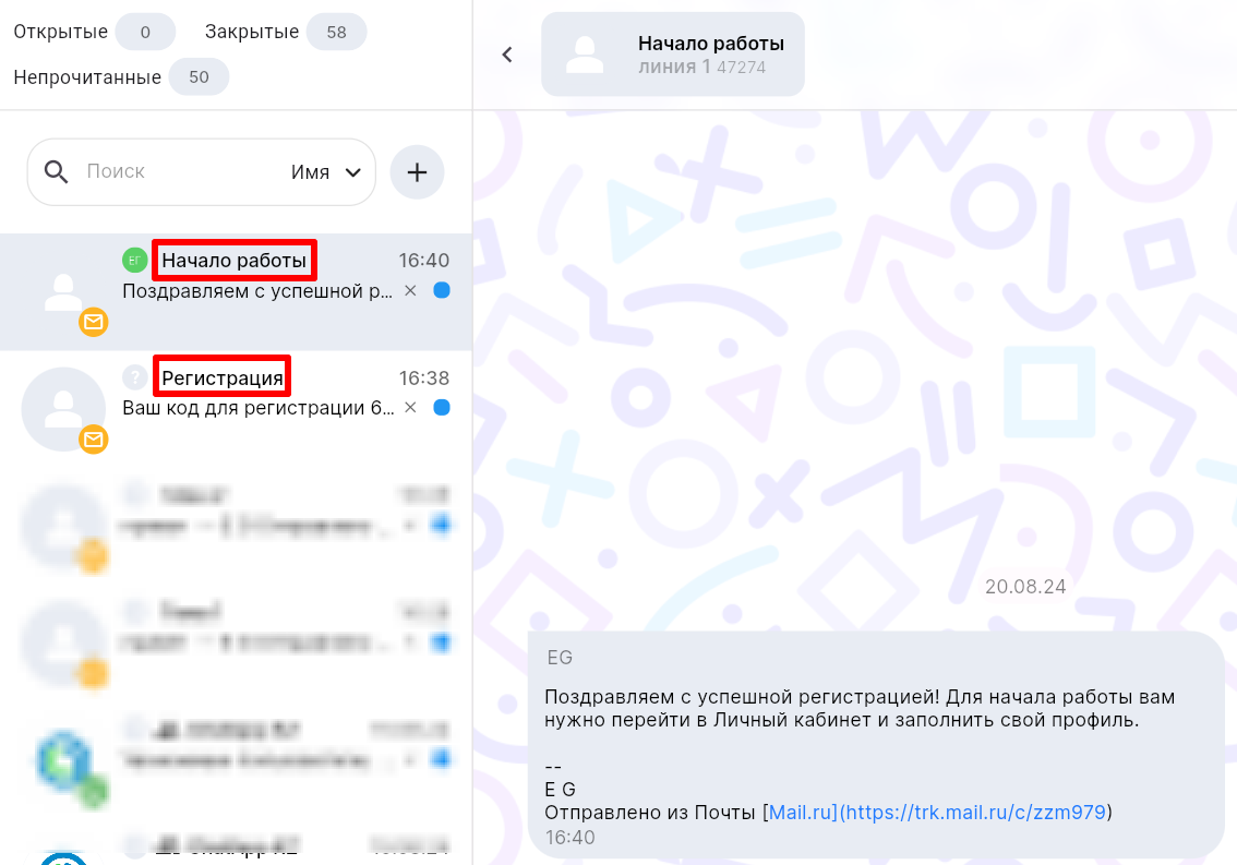 Если пункт Группировать письма отключен, то в названии чата будут отображаться данные электронной почты, а тема письма будет указана в начале сообщения в квадратных скобках. Все сообщения c этого адреса попадут в один чат.